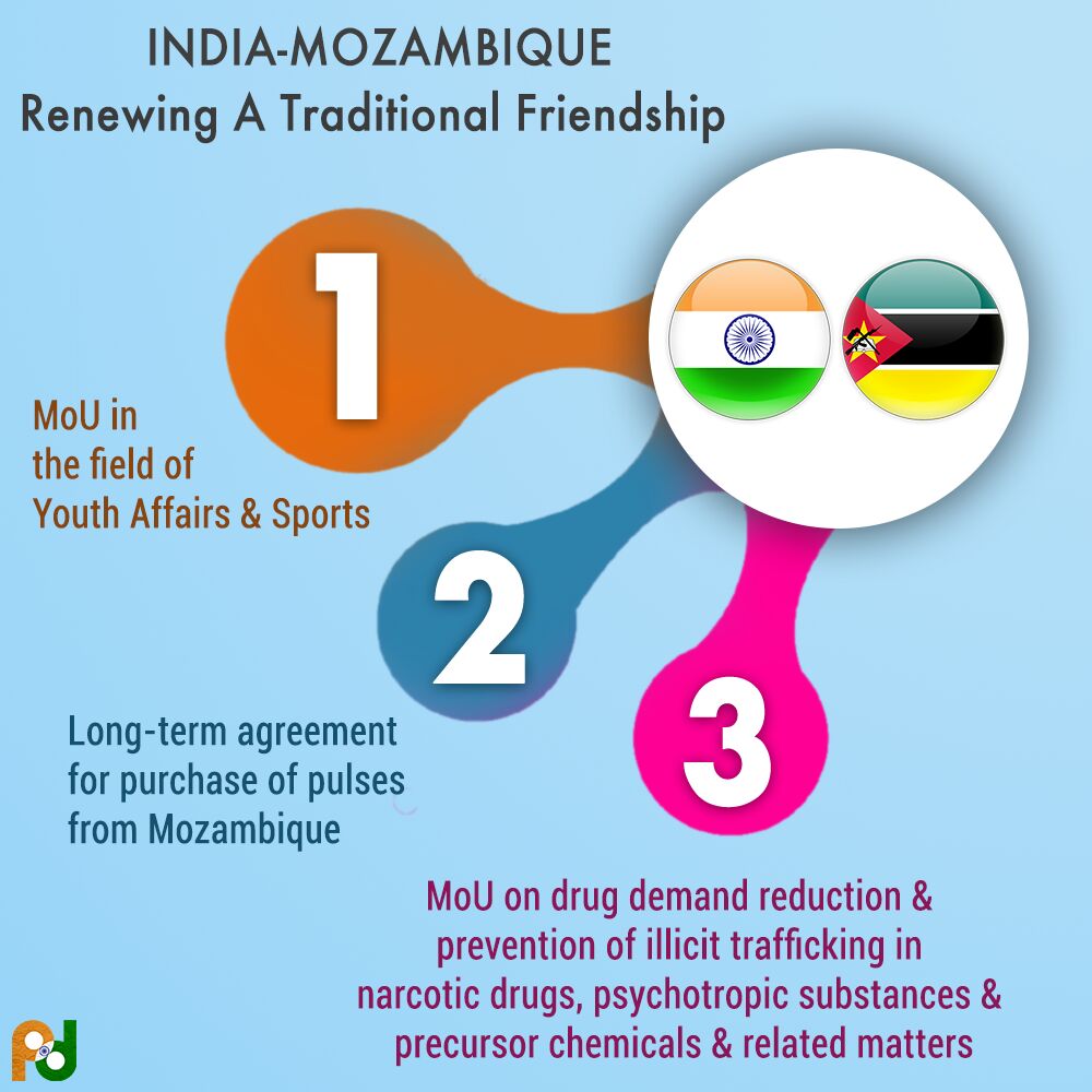 The visit of Prime Minister Narendra Modi to Maputo, Mozambique saw the two sides ink a total of three agreements on – Drug demand reduction and prevention of illicit trafficking in narcotic drugs, psychotropic substances and precursor chemicals and related matters ; Youth Affairs and Sports and for purchase of pulses from Mozambique.