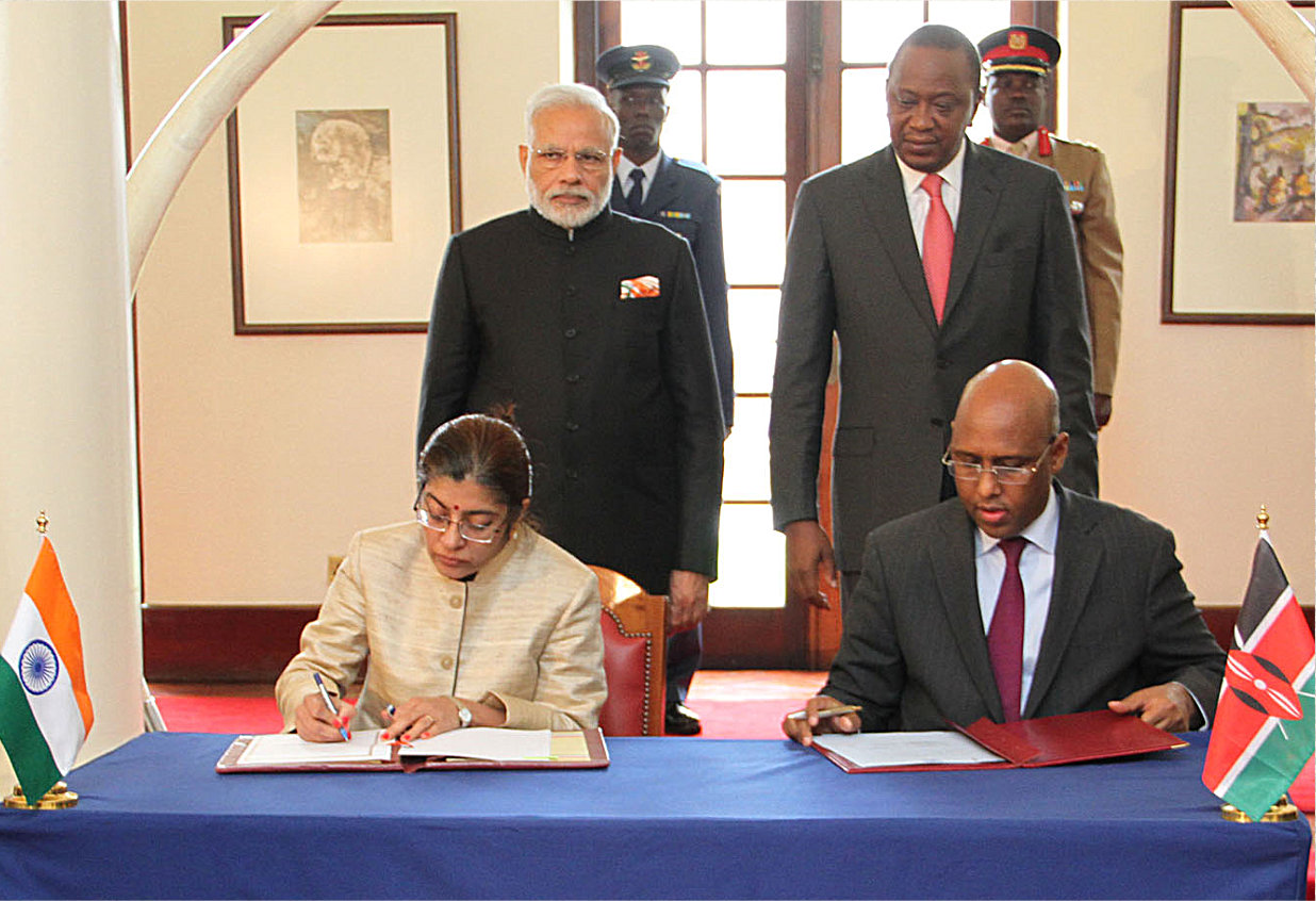 The two leaders reiterated their commitment to the continued expansion of excellent ties and to impart a fresh momentum for cooperation in all areas of mutual interest. Guided by the necessity to establish a solid framework to facilitate engagement between the two Governments, the seven bilateral instruments were concluded during the visit which included - MoUs on Defence Cooperation; Cooperation in the field of National Housing Policy Development and Management; Cooperation in the field of standardisation, expertise sharing and mutual trade between Bureau of Indian Standards and Bureau of Kenya Standards; exemption of Visa for holders of Diplomatic passports; Revised Double Taxation Avoidance Agreement (DTAA) and a Line of Credit Agreement for US $15 million to IDB Capital Limited, Kenya, for development of various small and medium enterprises in Kenya and a Line of Credit Agreement for US $29.95 million to the Government of Kenya for upgrade of Rift Valley Textiles Factory (RIVATEX East Africa Limited), Kenya