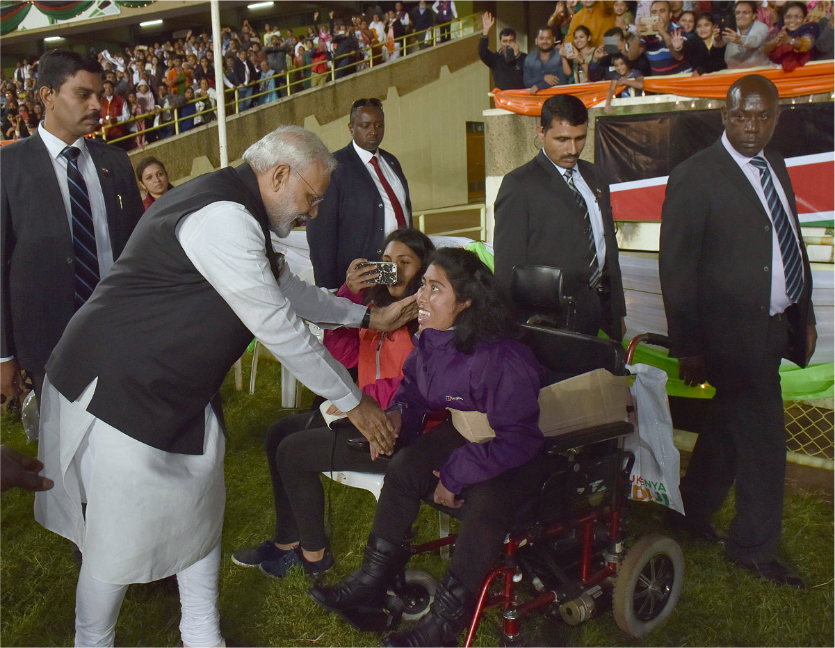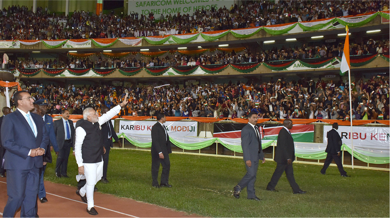 Accompanied by Kenyan President Uhuru Kenyatta, Prime Minister Narendra Modi kickstarted his engagements in Nairobi, Kenya on 10th July 2016, addressing a gathering of about 20,000 Indian Community members at Kasarani Stadium.