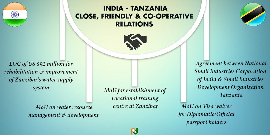 During the brief but crucial visit to Dar-Es-Salam, Tanzania, Prime Minister Modi held extensive talks with President Dr. John Magufuli to chalk out the road ahead for bettering India-Tanzania relations in a wide range of areas and witnessed exchange of five agreements ranging from MoUs on Water Resource Management and Development; establishment of Vocational Training Centre; Visa Waiver for Diplomatic and Official Passport holder; an agreement between the National Small Industries Corporation of India and the Small Industries Development Organisation as well as providing a Line of Credit of $92 million for rehabilitation and improvement of water supply system in Zanzibar.