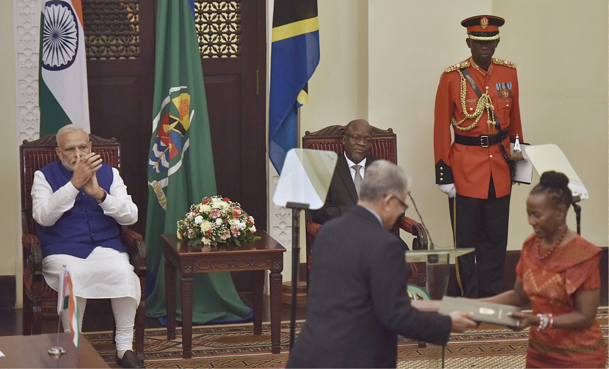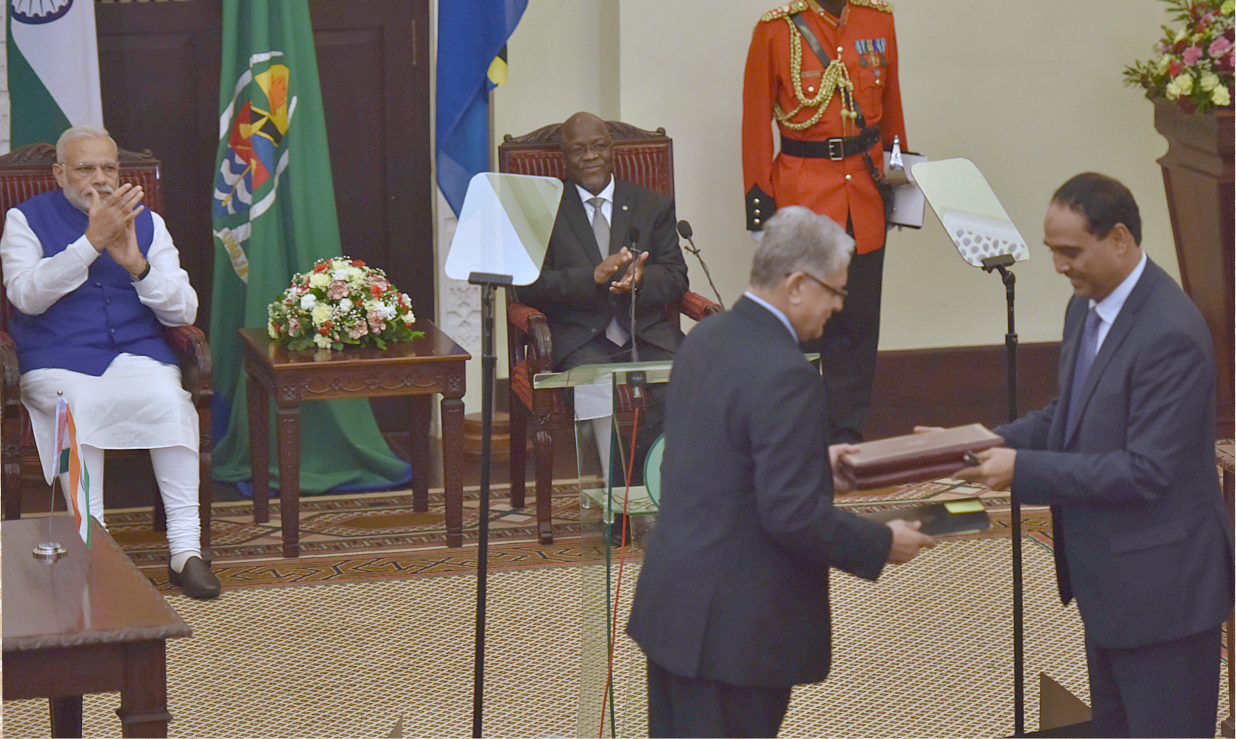 During the brief but crucial visit to Dar-Es-Salam, Tanzania, Prime Minister Modi held extensive talks with President Dr. John Magufuli to chalk out the road ahead for bettering India-Tanzania relations in a wide range of areas and witnessed exchange of five agreements ranging from MoUs on Water Resource Management and Development; establishment of Vocational Training Centre; Visa Waiver for Diplomatic and Official Passport holder; an agreement between the National Small Industries Corporation of India and the Small Industries Development Organisation as well as providing a Line of Credit of $92 million for rehabilitation and improvement of water supply system in Zanzibar.