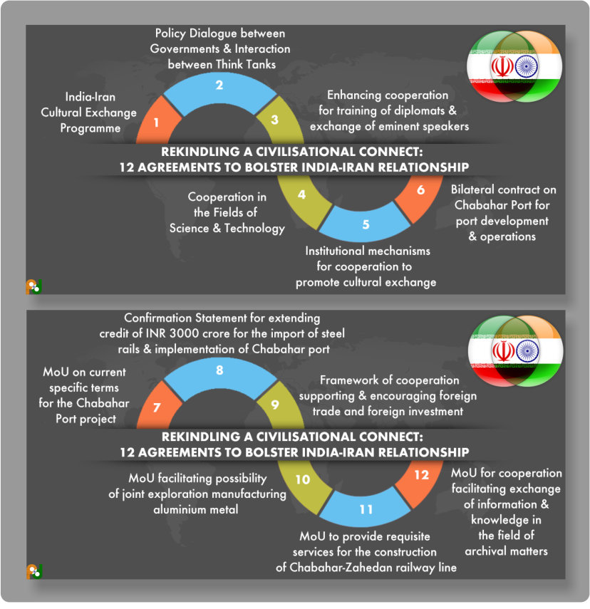 India and Iran inked a total of 12 agreements on economy, trade, transportation, infrastructure development, culture, science & technology and academic cooperation.